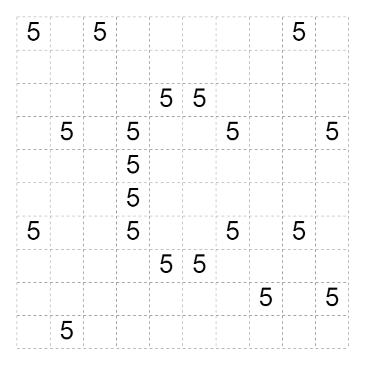 Today's Sashigane puzzle is an interesting one to me. Back near the start of this blog, I posted a 7x7 puzzle with 12 givens. This is a 10x10 puzzle with 14 givens, and much more interesting logic. Originally this would have been a 9x9 with a 9 clue in the middle, but I wasn't able to find a way to do what I wanted with that arrangement. Maybe someone else can manage that theme?